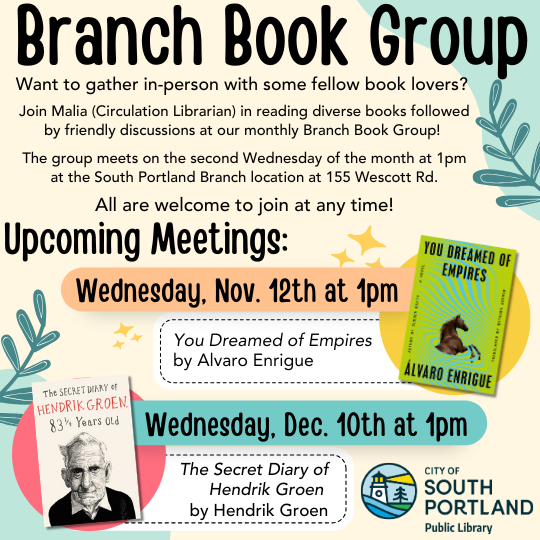 Want to gather in-person with some fellow book lovers? Join Malia (Circulation Librarian) in reading diverse books followed by friendly discussions at our monthly Branch Book Group! All are welcome to join at any time!